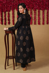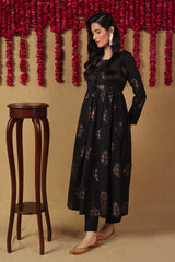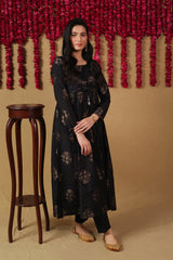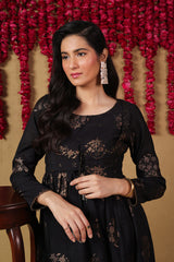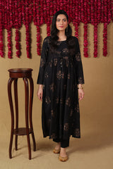 A fitted panelled flared dress with all over motif detailing and round neckline, featuring an attached koti detaling with mukaish detailing and gathers at the waist. Paired with a matching straight fit trouser.