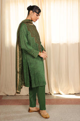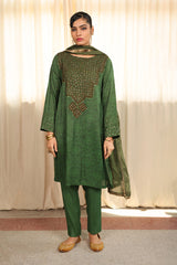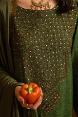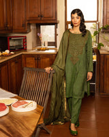 This formal dress features delicate embroidery with marorri  and sequins around the neckline, bodice and sleeves, adding an elegant look. The round neckline enhances its classic design. Paired with coordinating straight-fit trousers.