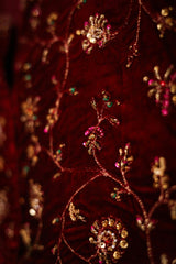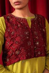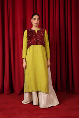 A formal koti featuring a round neckline with a V-slit open front, beautifully embellished with beadwork, sequin detailing, and intricate tilla taanka work, creating an elegant and refined look.