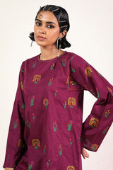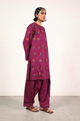 A loose fit mid length panelled printed kurta featuring a rounded keyhole neckline with button detailing and fish stitch details on the neckline and shoulders. Paired with a solid colour classic fit shalwar with stitch detailing at hems.