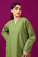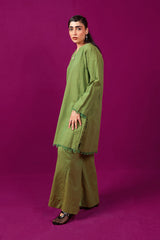 A loose fit two tone kurta with round neckline with V slit, featuring fringe details on sleeve and shirt hems, along with seashell detail on neckline. Paired with matching solid colour culotte trousers.