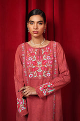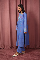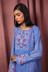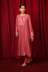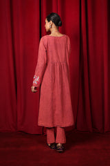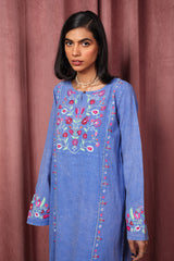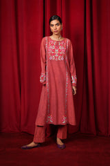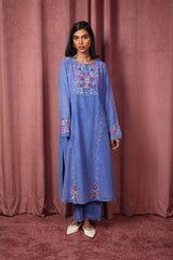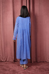 A solid-hued paneled kurta features a round neckline with a V-slit, enhanced by button detailing. The bodice is adorned with vibrant floral embroidery that extends to the sleeve borders while the panels are subtly embellished with floral bails. Gathered at the back empire waist, the kurta creates a natural, flattering silhouette. Paired with solid straight trousers, this ensemble combines elegance with ease.