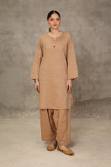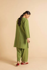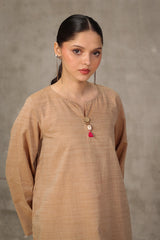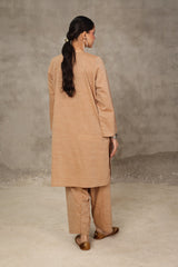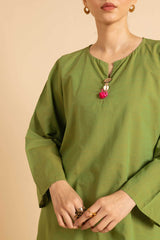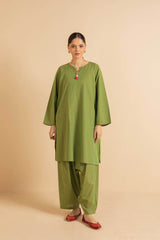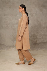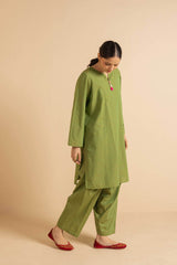 A versatile look with this straight-cut kurta, having boat neckline, embellished with buttons and tassels on the V-slit front. Paired with straight-cut wide-leg trouser.
