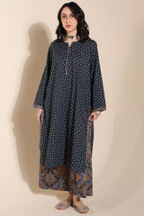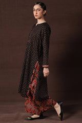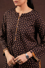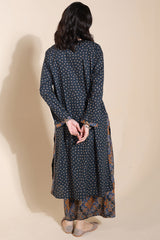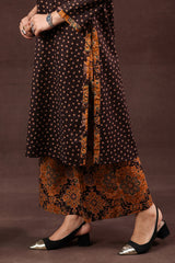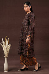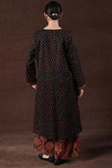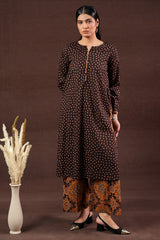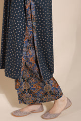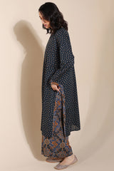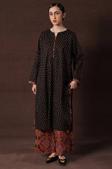 A classic-fit printed shirt with a round neckline and V-slit, adorned with delicate mirror accents along the placket. Paired with matching culottes for a balanced, contemporary ensemble.