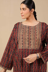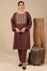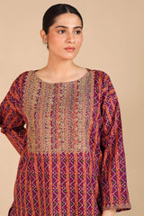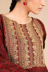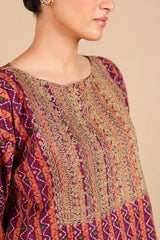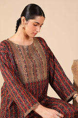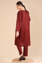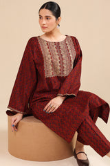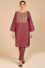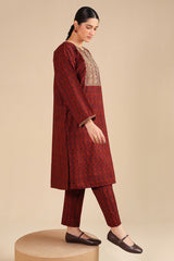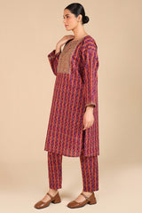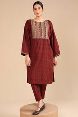 A classic-fit printed shirt with a round neckline, adorned with delicate embroidery on the bodice and sleeve hems. Paired with matching straight-fit trousers for a coordinated and stylish look.