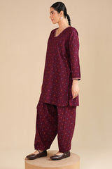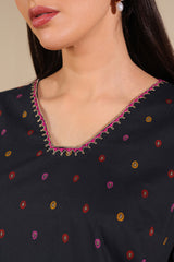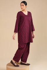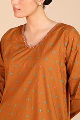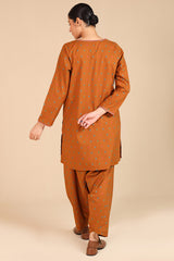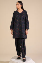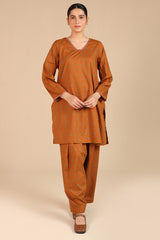 A classic-fit printed shirt with delicate embroidery on the neckline and sleeve hems, accented with subtle gold print. Paired with a matching printed classic-fit shalwar for a coordinated and elegant look.