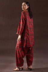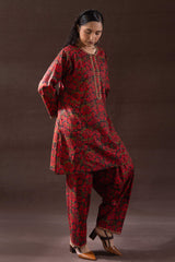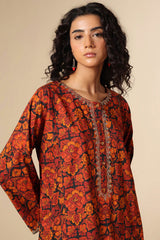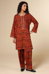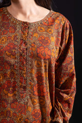 A classic-fit printed shirt with a round neckline and buttons along the front placket, featuring delicate embroidery on the neckline and sleeve hems. Paired with a matching printed classic-fit shalwar, accented with embroidered detailing on the ankle hemline.