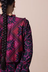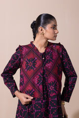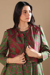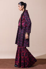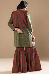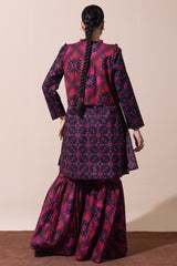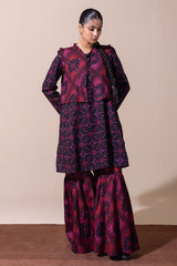 Classic-fit printed shirt adorned with subtle bead detailing along the neckline and sleeve hems, paired with a printed front-open sleeveless short koti featuring frill deatil along the front and sleeve hems. Styled with a matching printed gharara for a statement look.