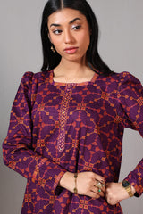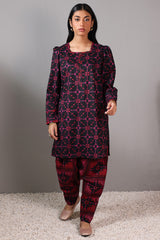 A classic-fit printed shirt with a square neckline and subtle mukaish detailing along the front slit. Paired with a matching printed pegged shalwar for a cohesive, contemporary look.