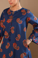 Paisley-printed classic fit shirt with a round neckline with a V-slit, adorned with tassel detailing. Paired with a matching printed pegged Shalwar.