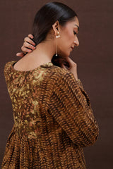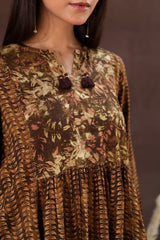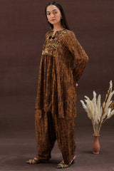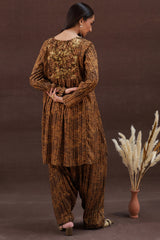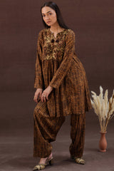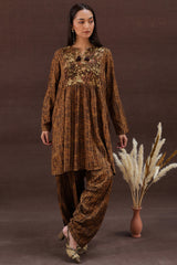 A printed flared shirt with a keyhole neckline and tassel detailing, enhanced with gathers for volume. Paired with a keychain-printed classic-fit shalwar for a coordinated look.