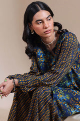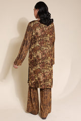 A straight classic-fit printed shirt with a round neckline and V-slit, adorned with tassels. Paired with printed culottes for a coordinated look.