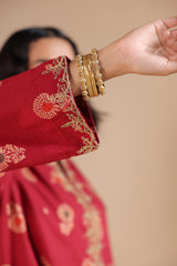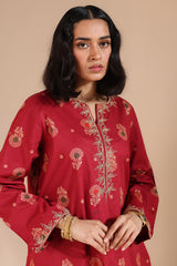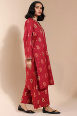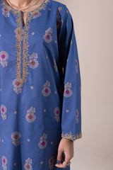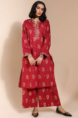 Gold-printed classic fit shirt with a round neckline and V-slit, adorned with delicate embroidered detailing on the neckline and sleeve hems. Paired with matching printed culottes.