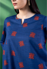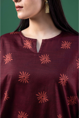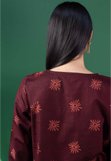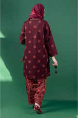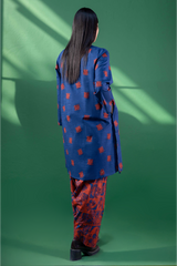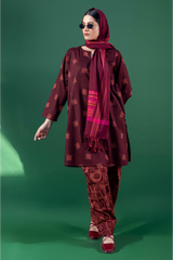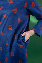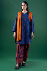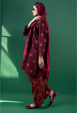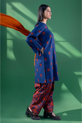 A classic-fit printed shirt with a low band neckline and V-slit, featuring side pockets. Paired with a complementary printed classic-fit shalwar finished with stitching detail along the ankle hem for a touch of understated elegance.