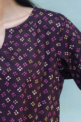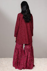 A classic-fit printed short shirt with a round neckline and V-slit, paired with a matching printed gharara for a graceful, traditional look.