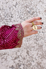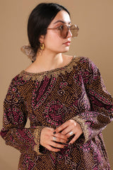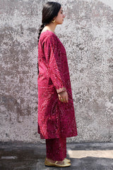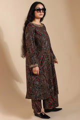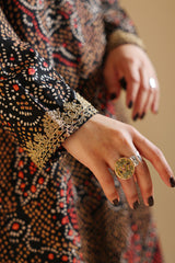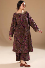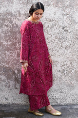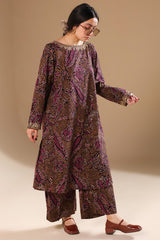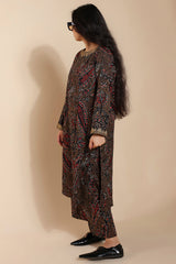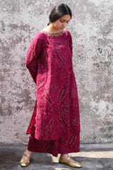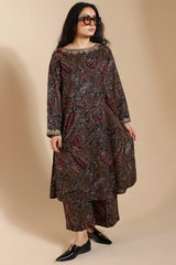 A classic-fit A-line printed shirt with a boat neckline, adorned with delicate golden embroidery along the neckline and sleeve hems. Paired with matching printed culottes.