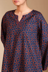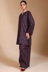 Relaxed-fit printed shirt with a round neckline and V-slit, adorned with delicate stitching detail along the slit and sleeve hems. Paired with matching printed farshi shalwar with fine stitching along the ankle hemline.