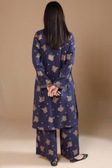 A classic-fit printed shirt with a round neckline and V-slit, featuring delicate stitching details along the front placket and sleeve hems. Side pockets add ease. Paired with matching printed culottes.