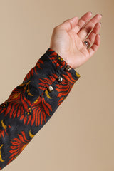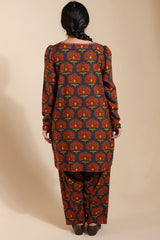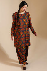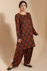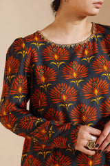 A classic-fit printed shirt with a round neckline, adorned with delicate embroidered detailing. Loop buttons along the sleeve hems add a refined touch. Paired with a matching printed khula poncha shalwar.