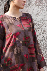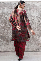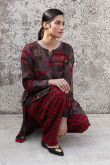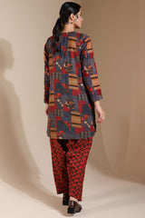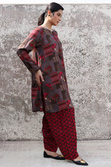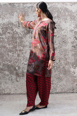 Classic-fit printed shirt with a round neckline and V-slit adorned with tassel detailing. Paired with a complementary printed classic-fit shalwar for a cohesive look.
