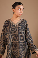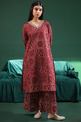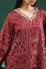 A classic-fit printed shirt with a V-neckline adorned with delicate embroidered details along the neckline and sleeve hems. Paired with matching printed culottes for a graceful, coordinated look.