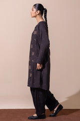 Classic-fit printed shirt with a round neckline and V-slit, adorned with delicate stitching detail. Paired with matching printed culottes for a relaxed yet refined look.
