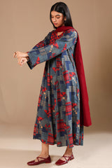 Classic printed flared dress with a V-neckline and gathers on the front and back for a flowy silhouette.
