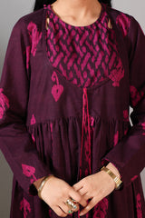 A long, flared printed dress with a round neckline and tassel detailing, gathered around the empire waist for a graceful flare.