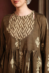 A long, flared printed dress with a round neckline and tassel detailing, gathered around the empire waist for a graceful flare.
