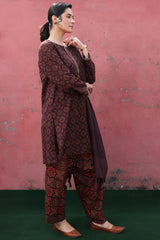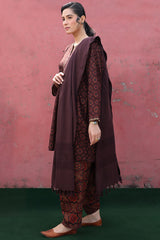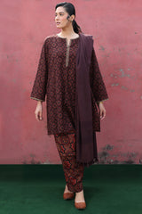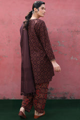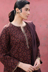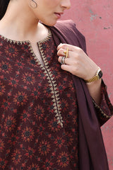 A classic-fit printed shirt with a round neckline and V-slit, adorned with delicate embroidered detailing on the neckline and sleeve hems. Paired with a complementary printed classic-fit shalwar.