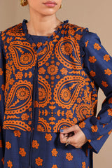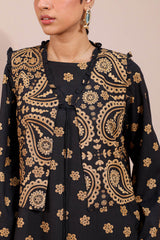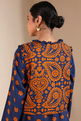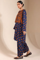 A classic-fit printed shirt with a round neckline, paired with a matching printed classic-fit shalwar. The set is styled with a front-open printed short koti featuring frilled edges and tassel detailing for a playful, layered look.
