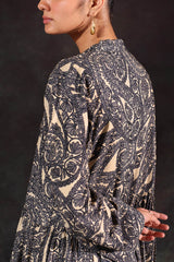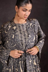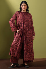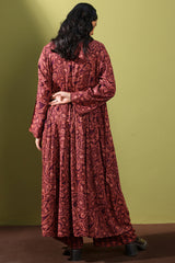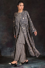 A classic-fit printed shirt with a square neckline and sleeveless cut, complemented by matching printed culottes. Paired with a front-open long flared Jama, featuring gathers around the waist for a flowy silhouette and a complete, graceful look.