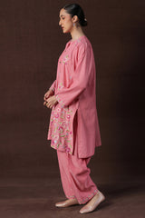 A delicate embroidered paneled A-line shirt with a round neckline and V-slit, adorned with buttons along the front placket. Paired with a classic-fit shalwar featuring embroidered detailing on the ankle hemline.