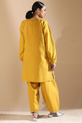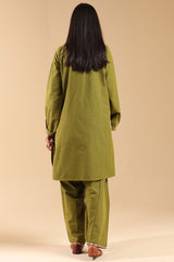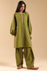 Classic-fit shirt with a round neckline, adorned with delicate stitching details. Embroidered accents enhance the front and side slits, while cuffed sleeve hems add a refined finish. Paired with a khula poncha shalwar, detailed with embroidery along the hemline.