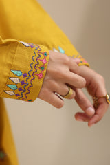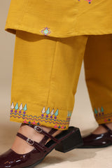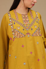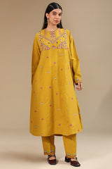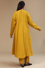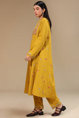 Embroidered paneled kurta with a round neckline and a generous flared silhouette. A back keyhole detail adds subtle interest, while vibrant embroidery enhances the design. Paired with straight-fit trousers finished with matching embroidered borders.