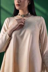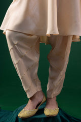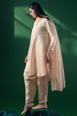 A luxury flared shirt crafted from rich fabric, with a round neckline and loop buttons along the front slit and sleeve hems. Golden lace accents the sleeves, while tassel detailing at the back adds charm. Styled with a lace-embellished classic-fit shalwar and an organza dupatta finished with golden lace detailing.