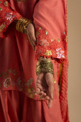 Embroidered classic-fit shirt with a round neckline and V-slit, adorned with fine embroidered detailing and lace accents. Paired with a classic-fit shalwar, finished with coordinated jaal lace detailing. Styled with a crushed dupatta for a textured, festive finish.