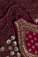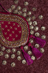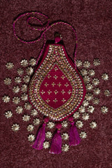 Deep magenta embroidered potli crafted in a teardrop silhouette, adorned with beads and sequins. Finished with bold tassels and a braided drawstring, it adds a rich, festive touch to any formal look.