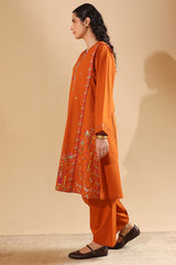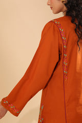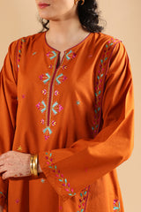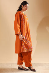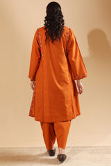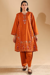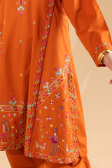 Hand-embroidered paneled shirt brought to life with vibrant, storytelling motifs that enhance the silhouette. Thoughtfully detailed embroidery adds depth and character throughout. Paired with a classic-fit shalwar, finished with embroidered accents along the hemline.