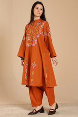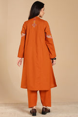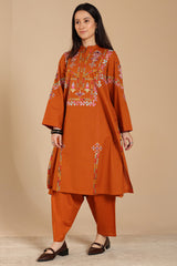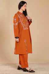 Hand-embroidered paneled kurta with a low band neckline, finished with delicate embellishment along the front placket. Vibrant embroidered details enhance the silhouette. Paired with a classic-fit shalwar, detailed at the ankle hemline.