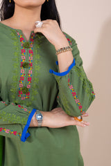 Handcrafted embroidered classic-fit shirt with a round neckline and V-slit, adorned with tassel detailing. Drop-shoulder style with cuffed sleeves, paired with straight-fit trousers.