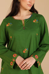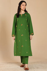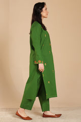 Embroidered classic-fit shirt with a round neckline and V-slit, adorned with delicate stitching and button detailing on the neckline. Paired with straight-fit trousers.
