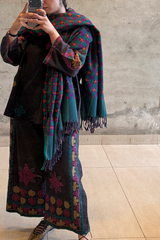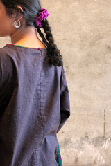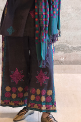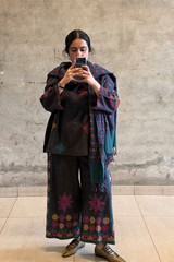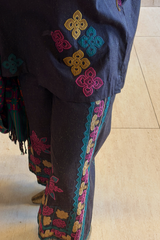 Speckled-base classic-fit appliquéd shirt with a round neckline, accented with delicate stitching along the neckline and sleeve hems, finished with a subtle keyhole at the back. Paired with classic culottes, enhanced with coordinated appliqué and embroidered accents.