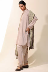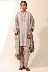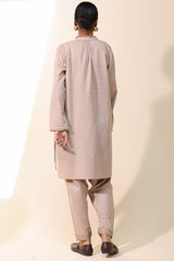 An embroidered classic-fit shirt with a low band neckline and buttoned front placket, adorned with frill detailing on the neckline and sleeve hems. Finished with a round shirt hem and paired with a classic-fit shalwar featuring embroidered detailing on the ankle hemline.