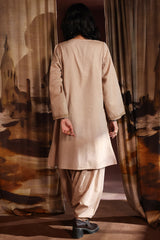An embroidered A-line shirt with a round neckline and V-slit, adorned with delicate embroidery along the neckline and sleeve hems. Paired with a jasmine shalwar featuring embroidered detailing on the ankle hemline.