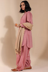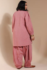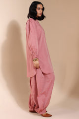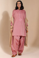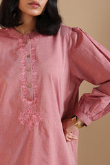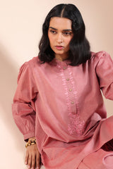Classic-fit embroidered shirt on textured fabric with a low band neckline and buttoned front placket. Finished with puff sleeves, cuffed hems, and a round shirt hem. Paired with textured fabric Jasmine shalwar for an understated look.