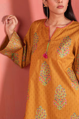 A classic-fit hand block-printed shirt on textured fabric with a round neckline and V-slit, adorned with delicate stitching and tassel detailing. Paired with matching textured culottes for an understated, artisanal charm.
