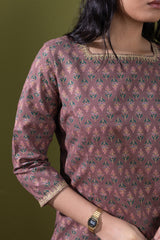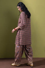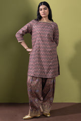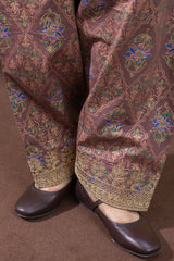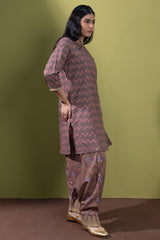 Gold-printed classic fit shirt with a square neckline, adorned with delicate embroidery along the neckline and sleeve hems. Paired with a printed shalwar featuring embroidered detailing along the ankle hemline.