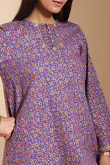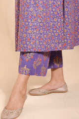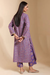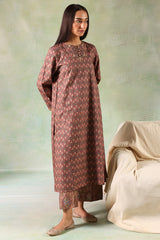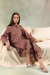 A straight-fit gold-printed shirt with a round neckline and loop buttons along the front placket, featuring subtle pleat detailing. Adorned with delicate embroidery on the neckline and sleeve hems. Paired with complementary straight-fit trousers for a refined look.