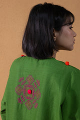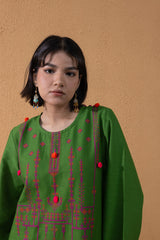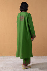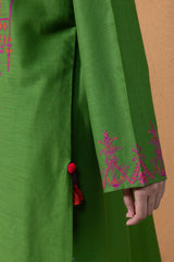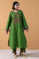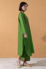 Embroidered classic-fit shirt, enhanced with delicate thread tassel accents. Designed with a round neckline and a subtle rounded hem, finished with tassel detailing along the side slits. Paired with straight-fit trousers featuring embroidered detailing at the ankle hems.